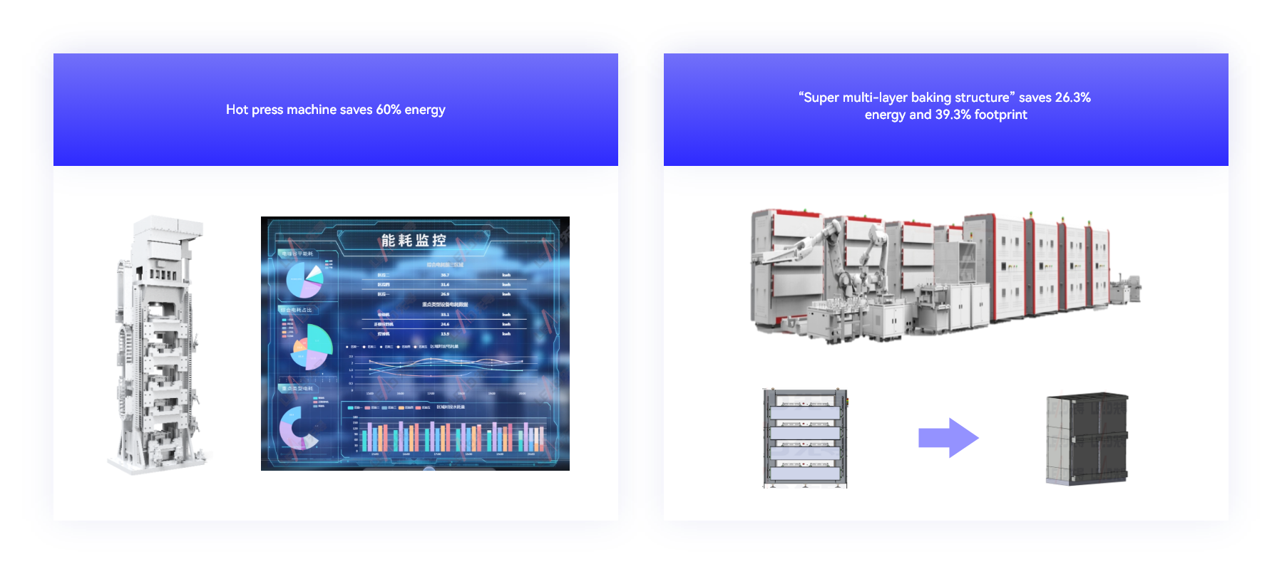 LEAD follows the call for energy saving and emission reduction: adopting new insulation materials, which helps to reduce 60% of hot press machine energy consumption; adopting multi-layer baking structure, saving 26.3% machine energy consumption, reducing machine footprint by 39.3%. We are helping customers to reduce operating costs.